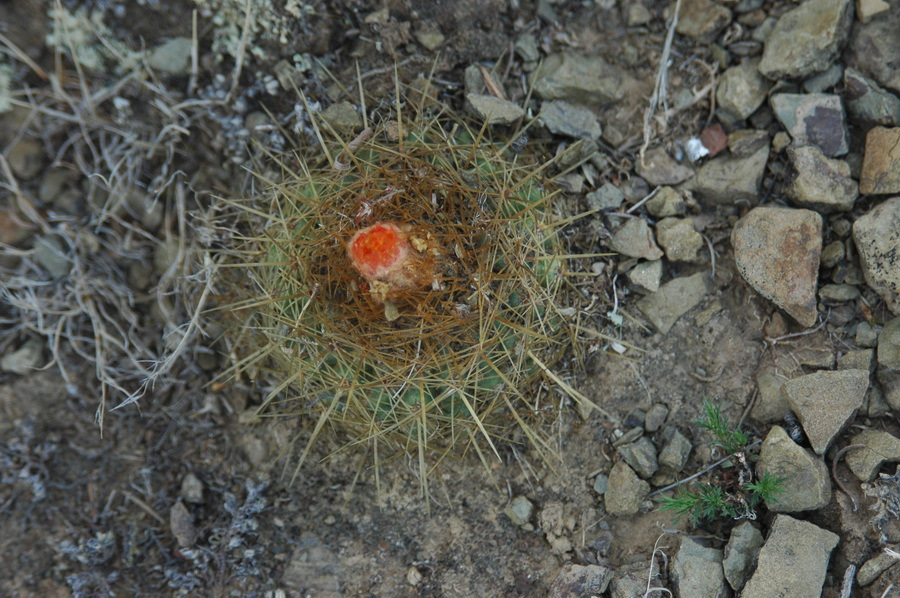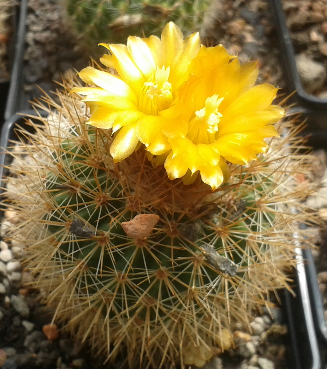 Körper halbkugelig bis leicht zylindrisch. bis 10 cm dick und 15/20 cm hoch. Nicht sprossend. 20-26 Rippen gerade oder spiralig verlaufend. Dornen nadelig, gelblich bis hellbräunlich, Mitteldornen rötlich hellbräunlich. 11-18 Randdornen bis 25 mm lang, 4-5 Mitteldornen ebenfalls bis 25 mm. Aufgrund der Anordnung und Stellung aller Dornen einer Areole erscheinen sie als Ganzes oft wie ein abstehendes Büschel. Blüten bis 40 mm Durchmesser, goldgelb.Verbreitung: