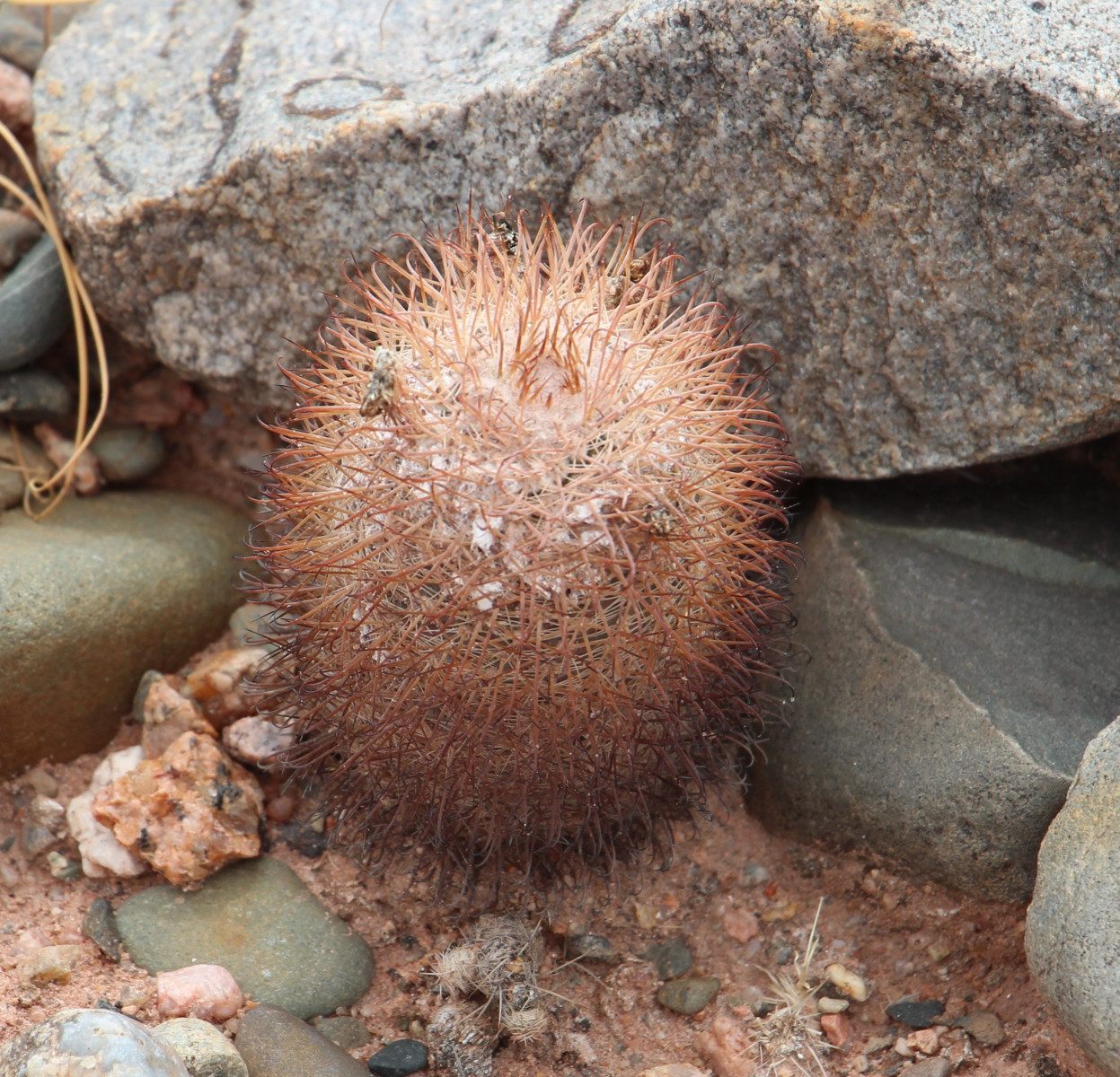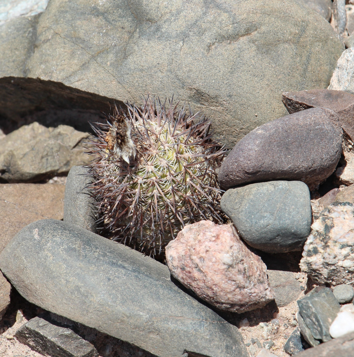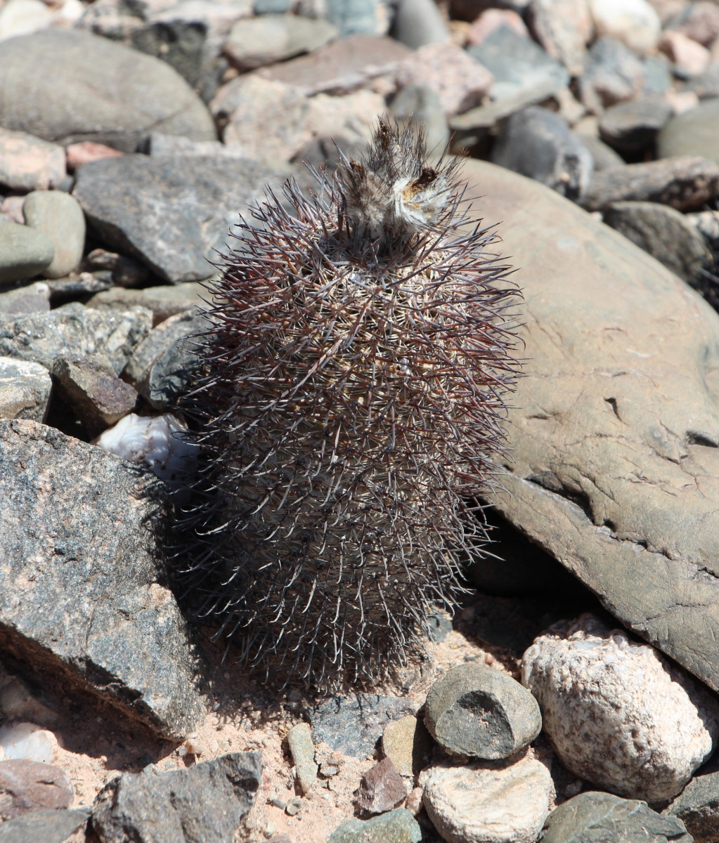 Pflanzen aufrecht stehend, graugrün, bei intensiver Sonneneinstrahlung ins bräunliche driftend, ca. 8 cm hoch, 5 cm Durchmesser, Rippen 13, spiralig angeordnet, Blüte gelbAnm. Uwe Lindner: Am Standort wurden zweifarbige Blüten beobachtet. Inwiefern das eine Ausnahme ist und somit nur einzelne Exemplare betrifft ist aktuell unklar