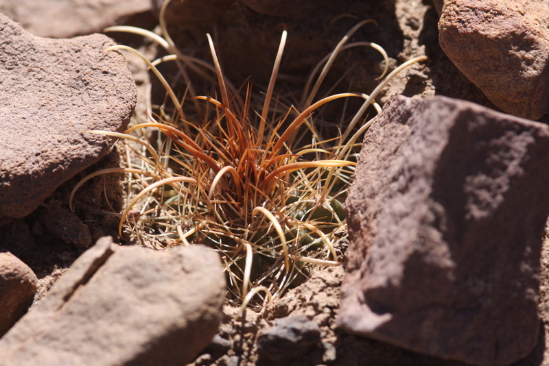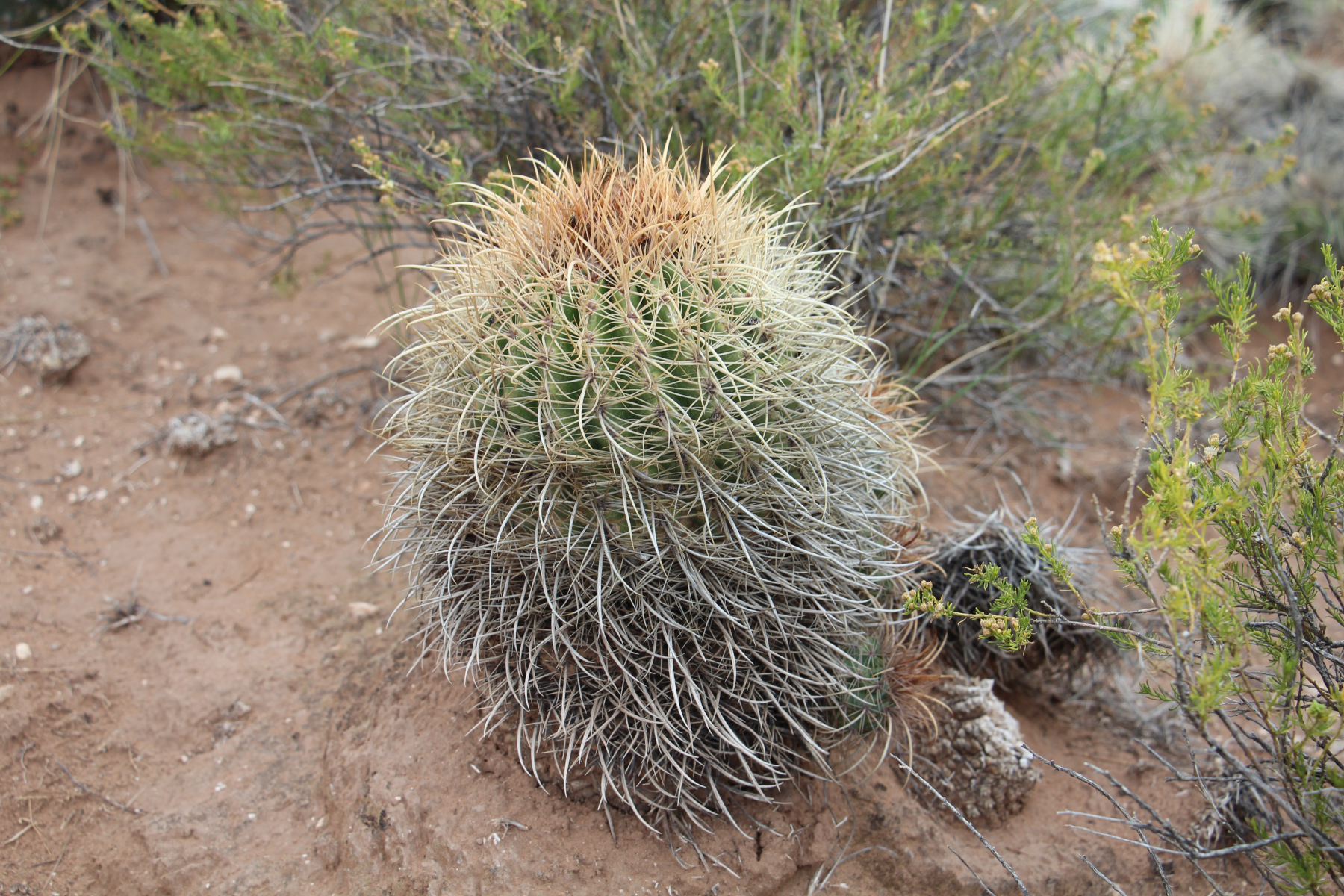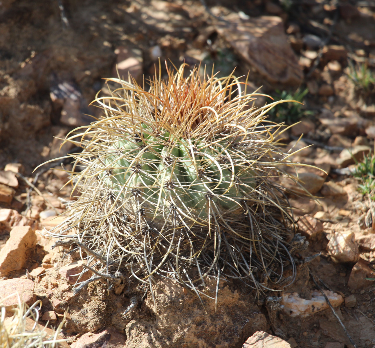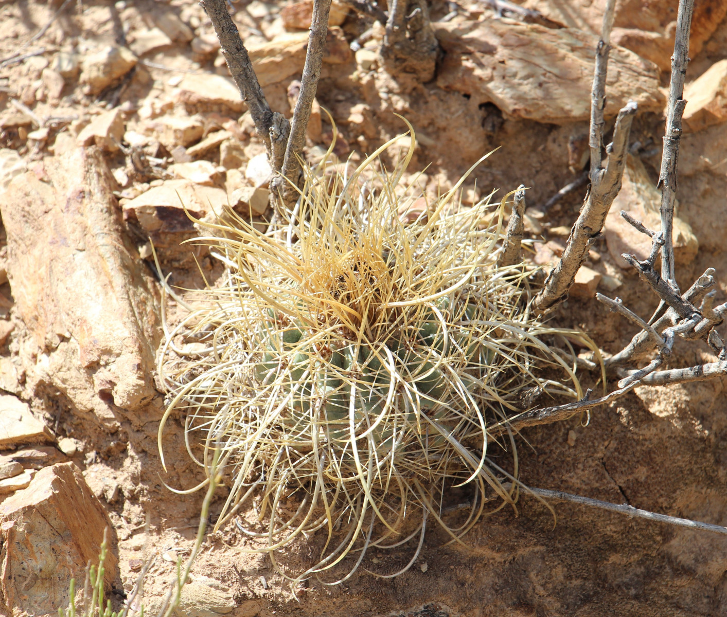 Kugelig bis länglich, bis 15 cm breit, frischgrün, oben gerundet, im Scheitel weißwollig und von St. überragt; Rippen 13—21, spiralig gedreht, vorspringend gehöckert, nach unten verflachend; Areolen rundlich, 3—4 mm ∅, weißwollig; Randst. 8—10 (—15), abstehend, 5—10 mm lang, anfangs honiggelb, später mehr weißlich, einige gebogen; Mittelst. 4, kräftiger, am Grunde zwiebelig verdickt, abwärts gewunden und hakig gekrümmt, der unterste bis 3 cm oder mehr lang, anfangs hellbraun; Bl. mäßig groß, weißwollig behaart, ebenso Ov.; Pet. lineallänglich, kupfrig gelbrot; N. gelb; Fr. trocken; S. größer als bei den Arten mit sehr feinen S., mattschwarz.Verbreitung: