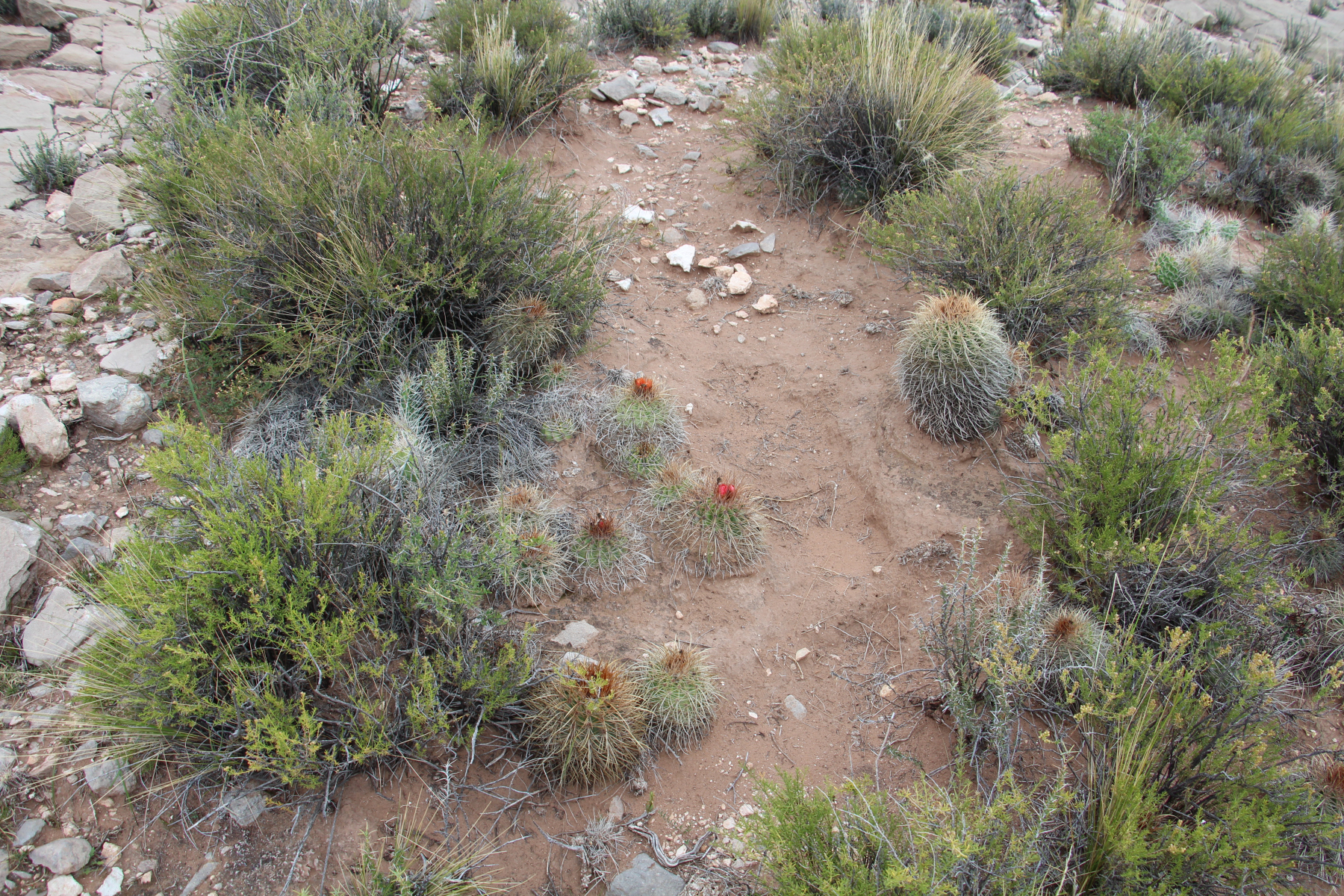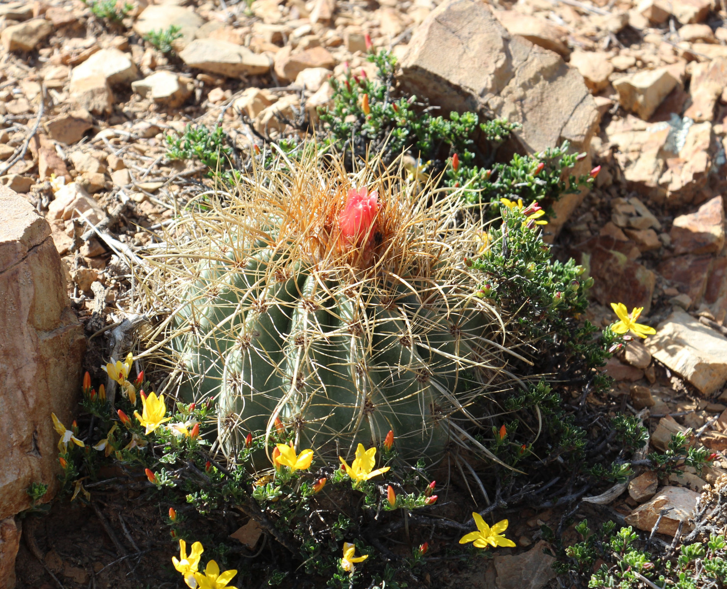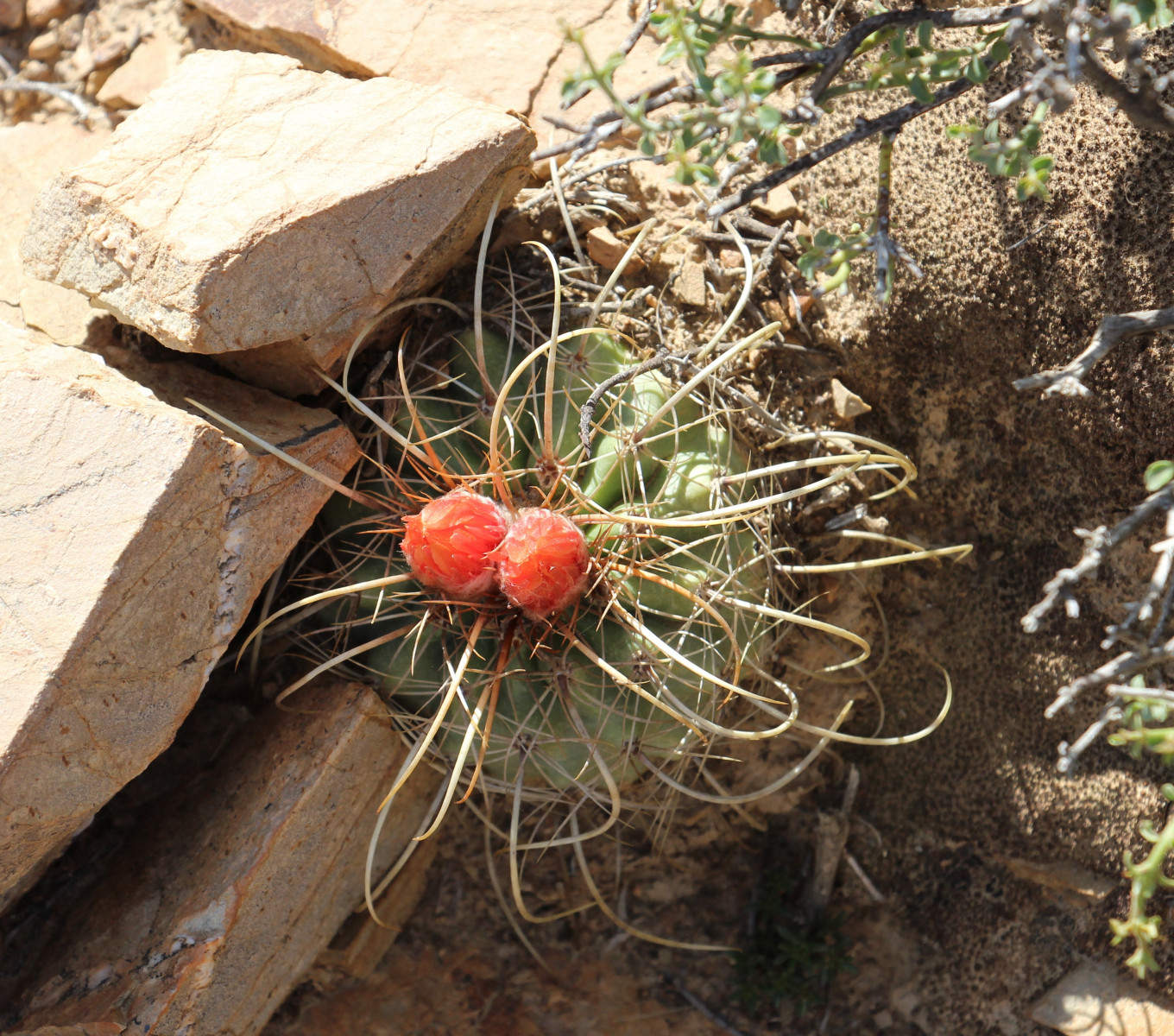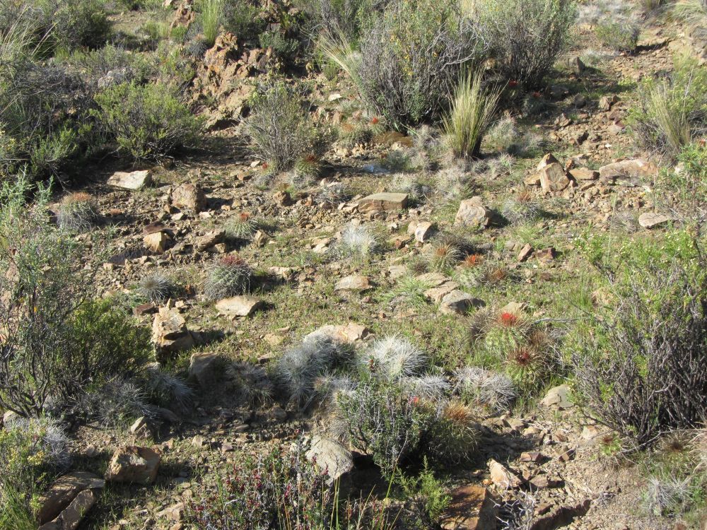 Kugelig bis länglich, bis 15 cm breit, frischgrün, oben gerundet, im Scheitel weißwollig und von St. überragt; Rippen 13—21, spiralig gedreht, vorspringend gehöckert, nach unten verflachend; Areolen rundlich, 3—4 mm ∅, weißwollig; Randst. 8—10 (—15), abstehend, 5—10 mm lang, anfangs honiggelb, später mehr weißlich, einige gebogen; Mittelst. 4, kräftiger, am Grunde zwiebelig verdickt, abwärts gewunden und hakig gekrümmt, der unterste bis 3 cm oder mehr lang, anfangs hellbraun; Bl. mäßig groß, weißwollig behaart, ebenso Ov.; Pet. lineallänglich, kupfrig gelbrot; N. gelb; Fr. trocken; S. größer als bei den Arten mit sehr feinen S., mattschwarz.Verbreitung: