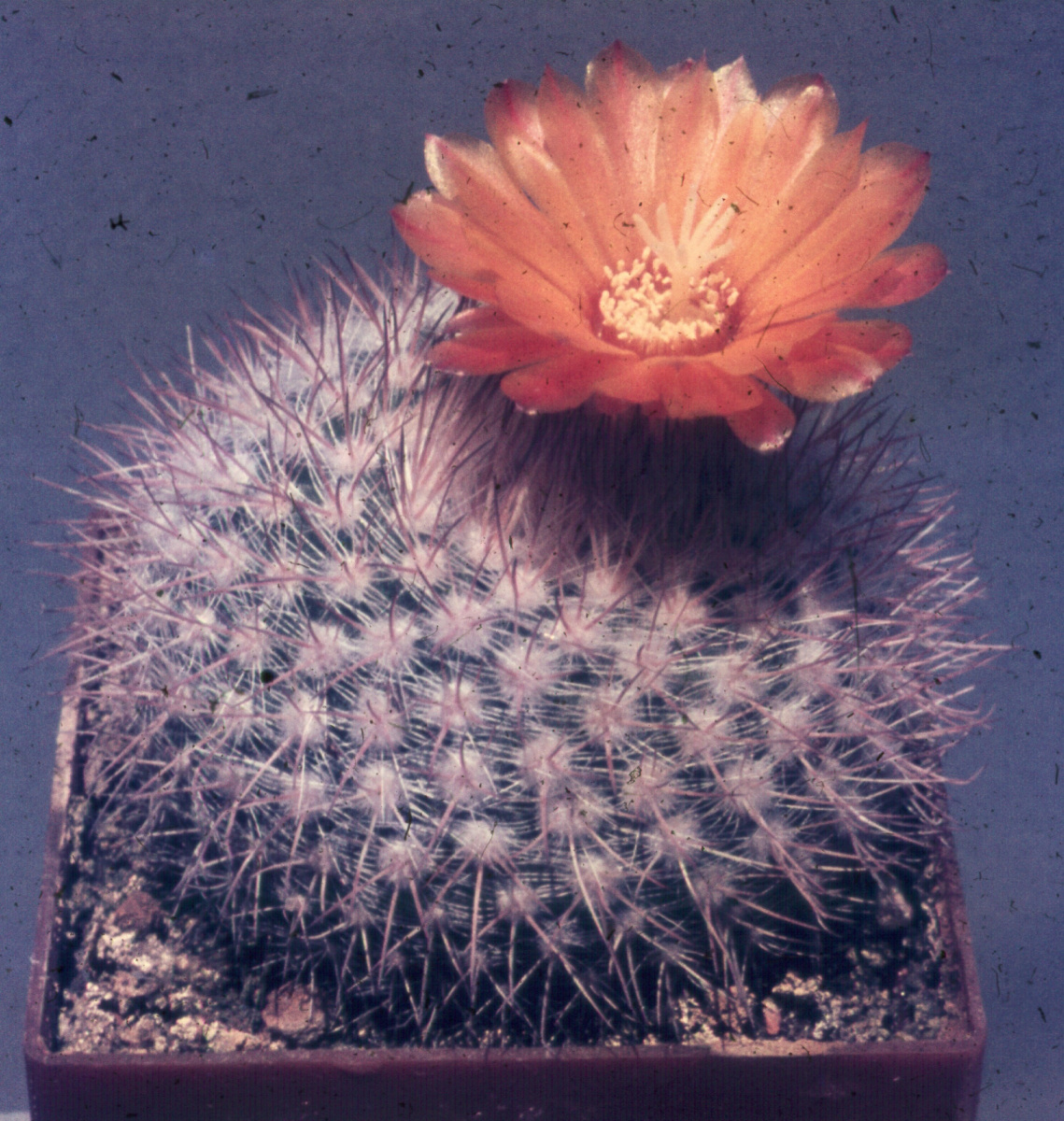 einzeln, Körper bis 6 cm hoch, und 5 cm im Durchmesser, laubgrün, Rippen 20...26, gerade oder leicht gedreht, Areolen rund ca. 2 mm Durchmesser, mit weißem bis gelbbraunen Filz und ca. 3 mm Abstand; Randstacheln 20-24, 5...6 mm lang, gerade, anliegend und seitlich verflochten, glasig weiß; Mittelstacheln 6-8, 8...9 mm lang, Blüte aus dem Scheitel erscheinend, 35...40 mm im Durchmesser, ebenso lang, Blüten, rot, orange und gelb, recht variabel was zur Kreation verschiedener Namen beigetragen hat.Verbreitung: