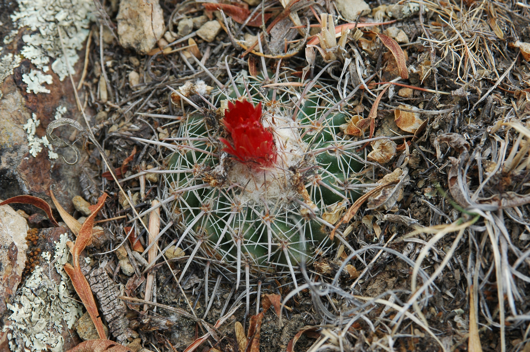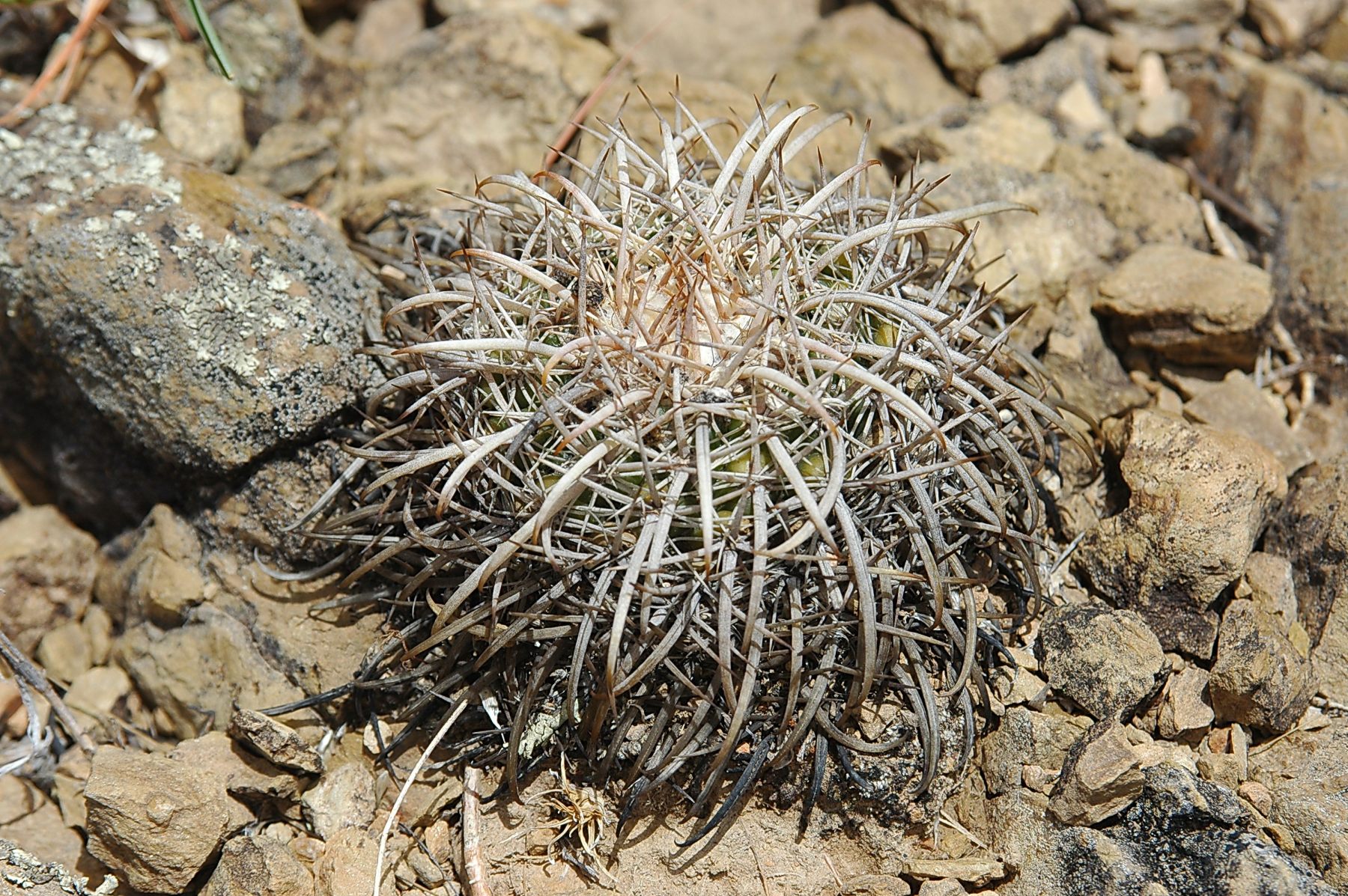 spiralig gedreht; Areolen 5—7 mm entfernt: Randst. ca. 10, anfangs hell hornfarbig,