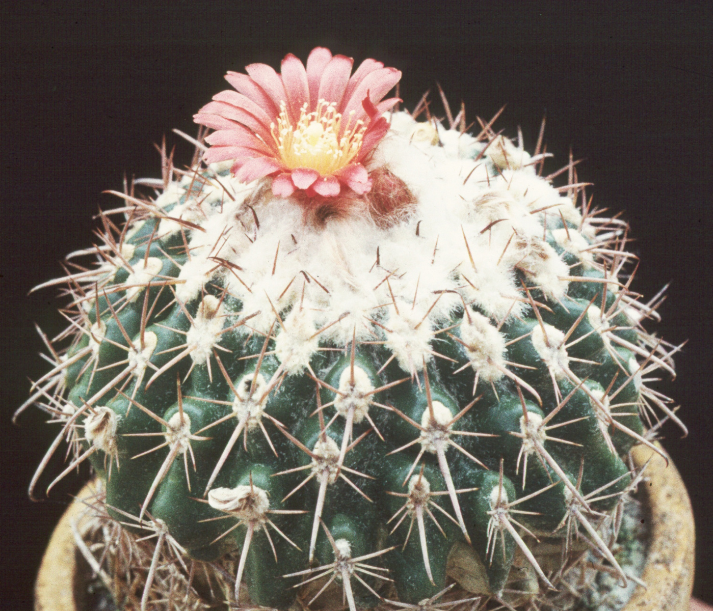 grün; Scheitel stark weißwollig; Rippen 13—20, schwach gehöckert.